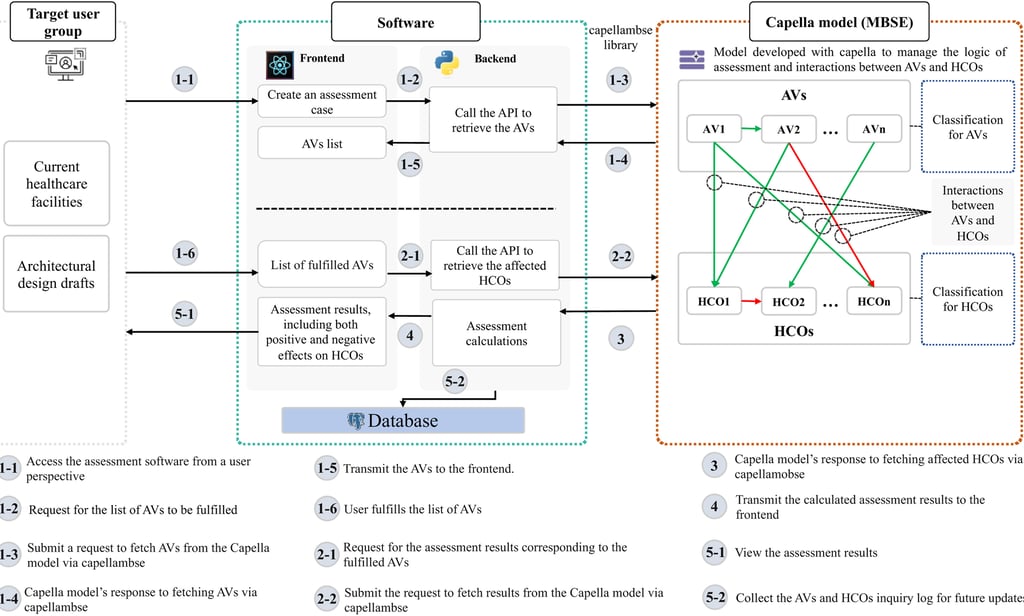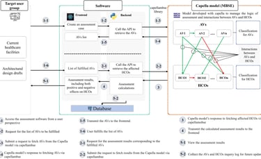 The calculation engine using Model-Based Systems Engineering (MBSE) was built. As a case study, we focus on dementia-friendly nursing home design and derive the model from a review of 105 evidence-based design studies, extracting 40 architectural variables (AVs), 36 health/care outcomes (HCOs), and 396 AV–HCO interactions. Importantly, the model includes not only direct AV→HCO links, but also indirect chains (AV–AV–HCO and AV–HCO–HCO), reflecting that design effects often operate through intermediate variables/outcomes.